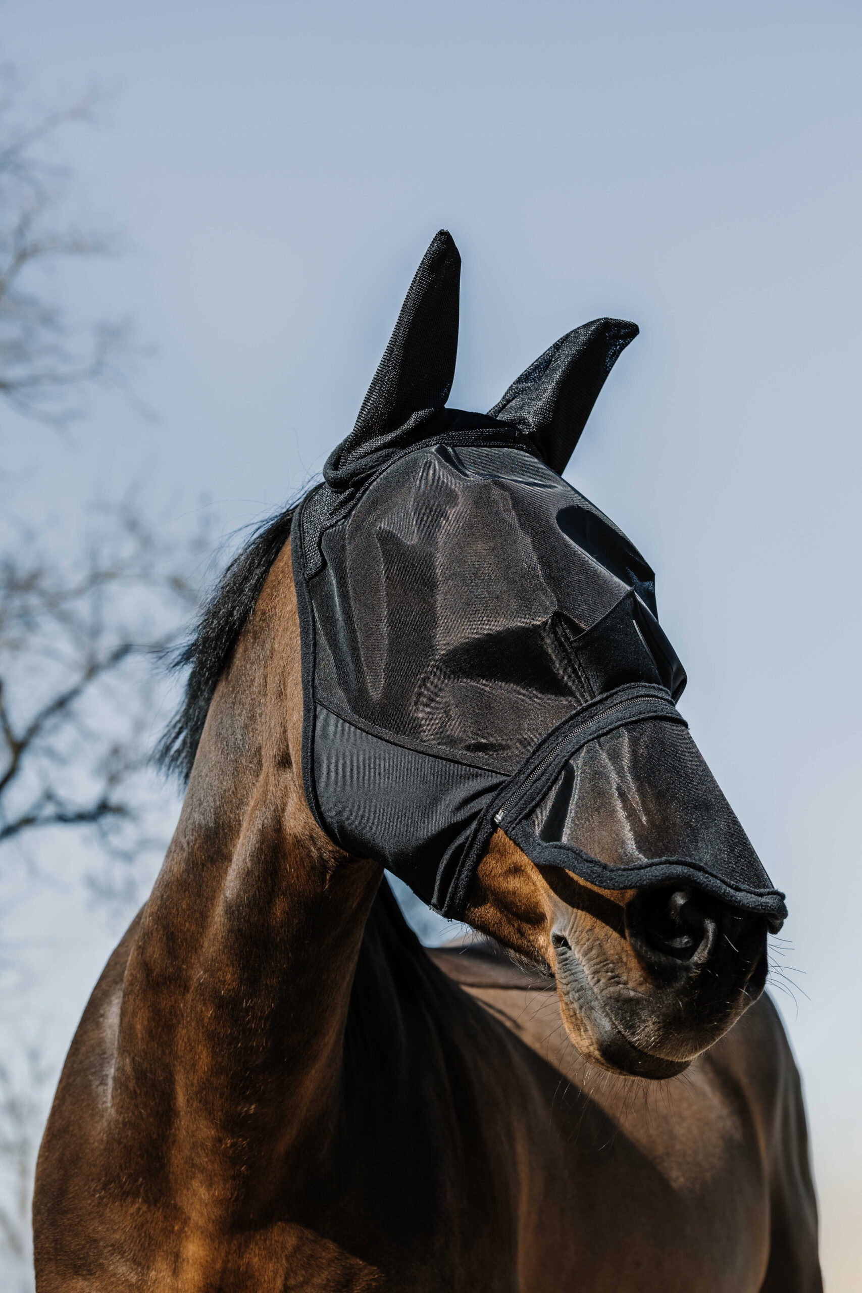 Le masque est équipé d’une structure en forme de ballon, permettant de rester éloigné de la tête du cheval et d’éviter ainsi tout frottement ou irritation autour des yeux. Il offre également une protection anti-UV 50, garantissant sécurité et confort même lors d’expositions prolongées au soleil.