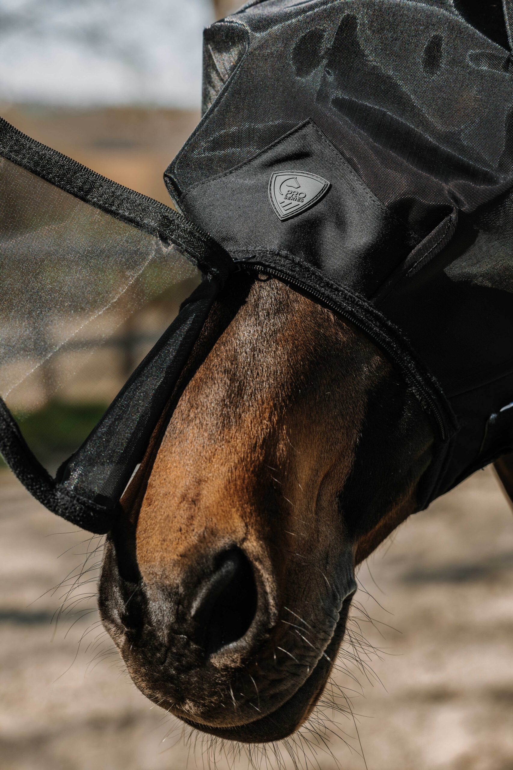 La protection de nez amovible avec fermeture à glissière permet d’adapter le masque selon les besoins et les préférences du cheval. Le système de fixation au niveau de la sous-gorge, composé de deux bandes auto-agrippantes, assure un ajustement sûr et personnalisé. La bordure en polaire ajoute confort et douceur, évitant les irritations, tandis que la conception ergonomique offre un large champ de vision pour que le cheval reste pleinement conscient de son environnement.