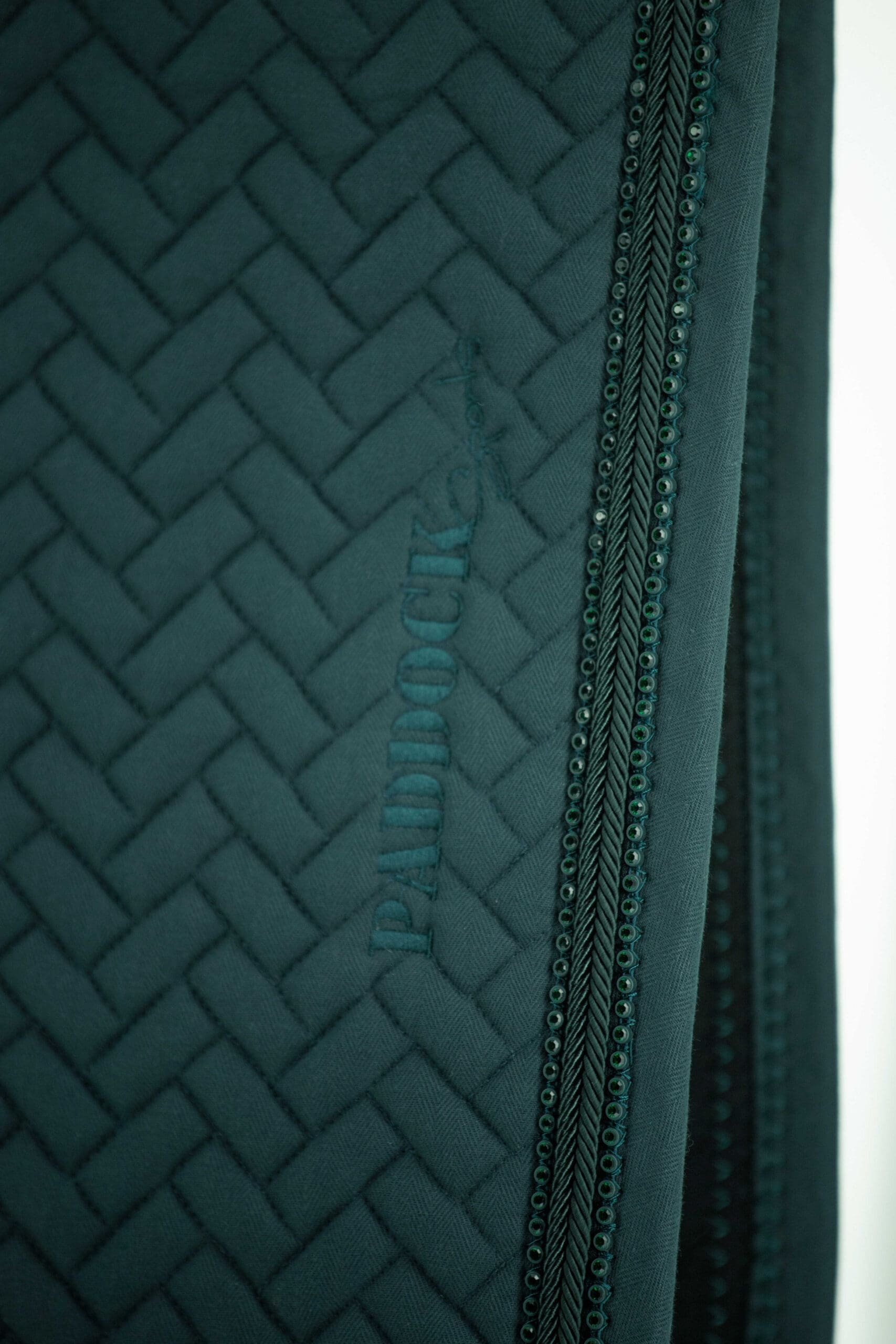 Il est matelassé finement en chevron et galonné d'une tresse avec un rang de strass de chaque côté. Une petite broderie Paddock Sports ton sur ton est visible à l'arrière gauche. À l'intérieur, il est doublé d'un tissu nid d'abeilles noir qui lui confère des propriétés de respirabilité et de confort.