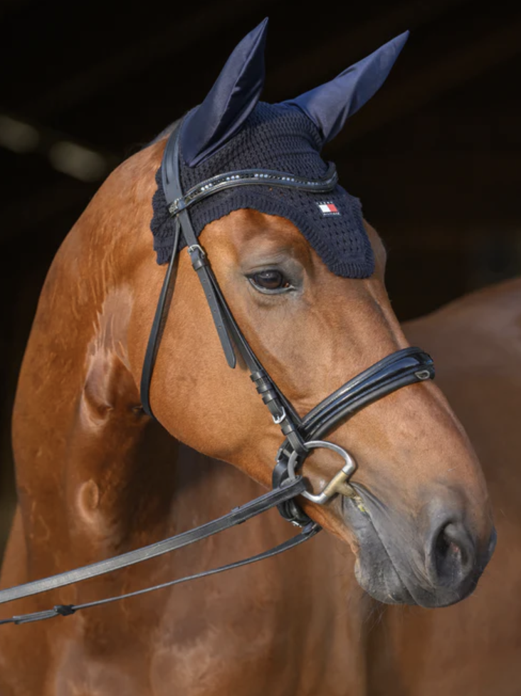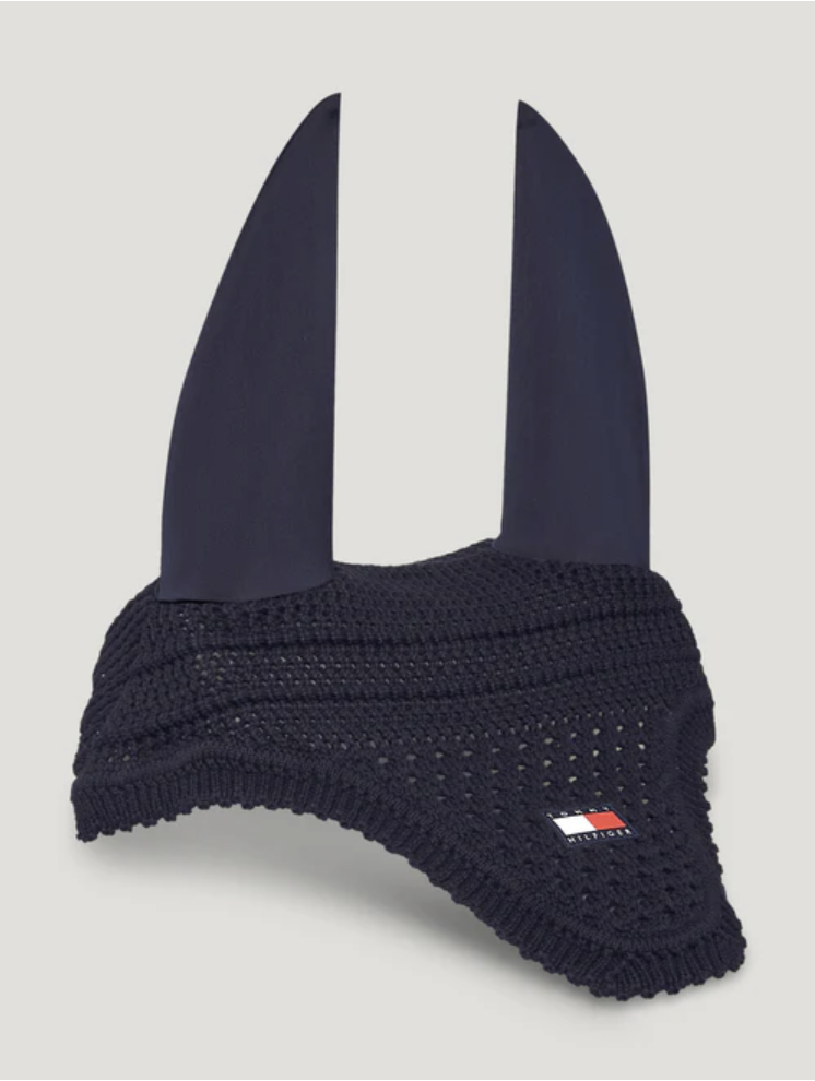 Ce bonnet crocheté en coton protège le cheval des insectes tout en restant respirant. Les oreilles légères en polyester stretch assurent confort et liberté de mouvement. Avec patch logo Tommy Hilfiger et liseré contrastant, il allie style, maintien et praticité, parfait pour entraînement ou compétition.