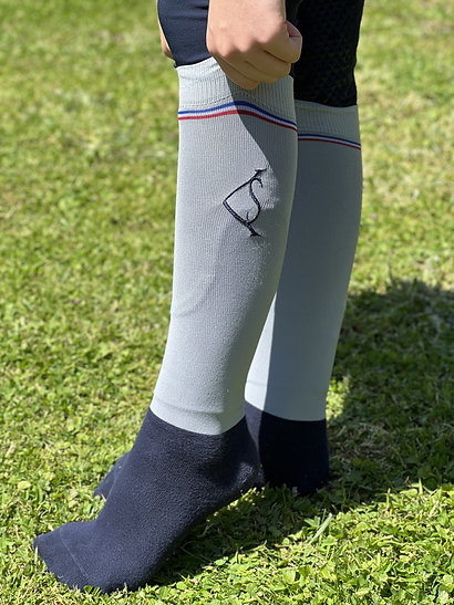 Chaussettes équitation fines et confortables, idéales pour les cavaliers. Tige en polyamide et élasthanne pour un maintien parfait du mollet, zone du pied renforcée en coton pour respirabilité et confort. Logo KS contrasté sur le côté. Fabriquées en France. Disponibles en tailles 35-38, 39-42