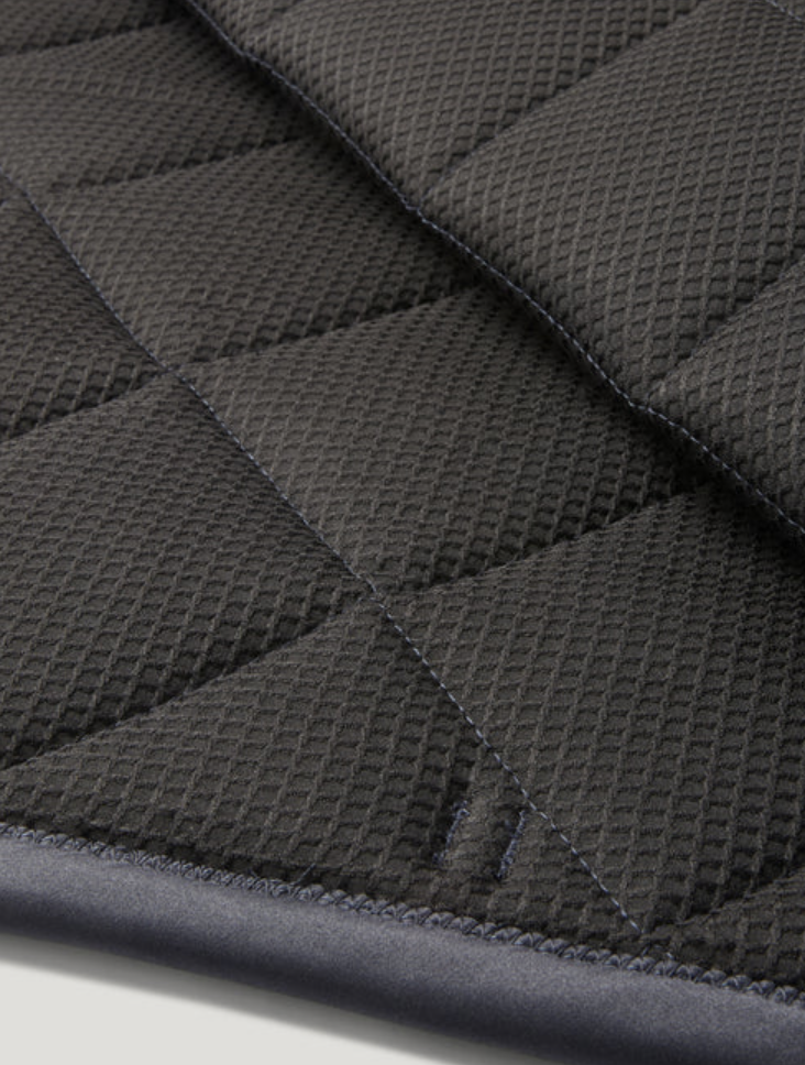Le tapis offre un confort optimal pour le cheval, grâce à une matière douce au toucher qui assure un maintien parfait sur le dos. La doublure en waffle knit (structure gaufrée) est respirante et régule l’humidité, permettant au cheval de rester au sec et à l’aise même lors des efforts intenses. Cette conception technique contribue à réduire les points de pression et à optimiser le confort pendant la monte.